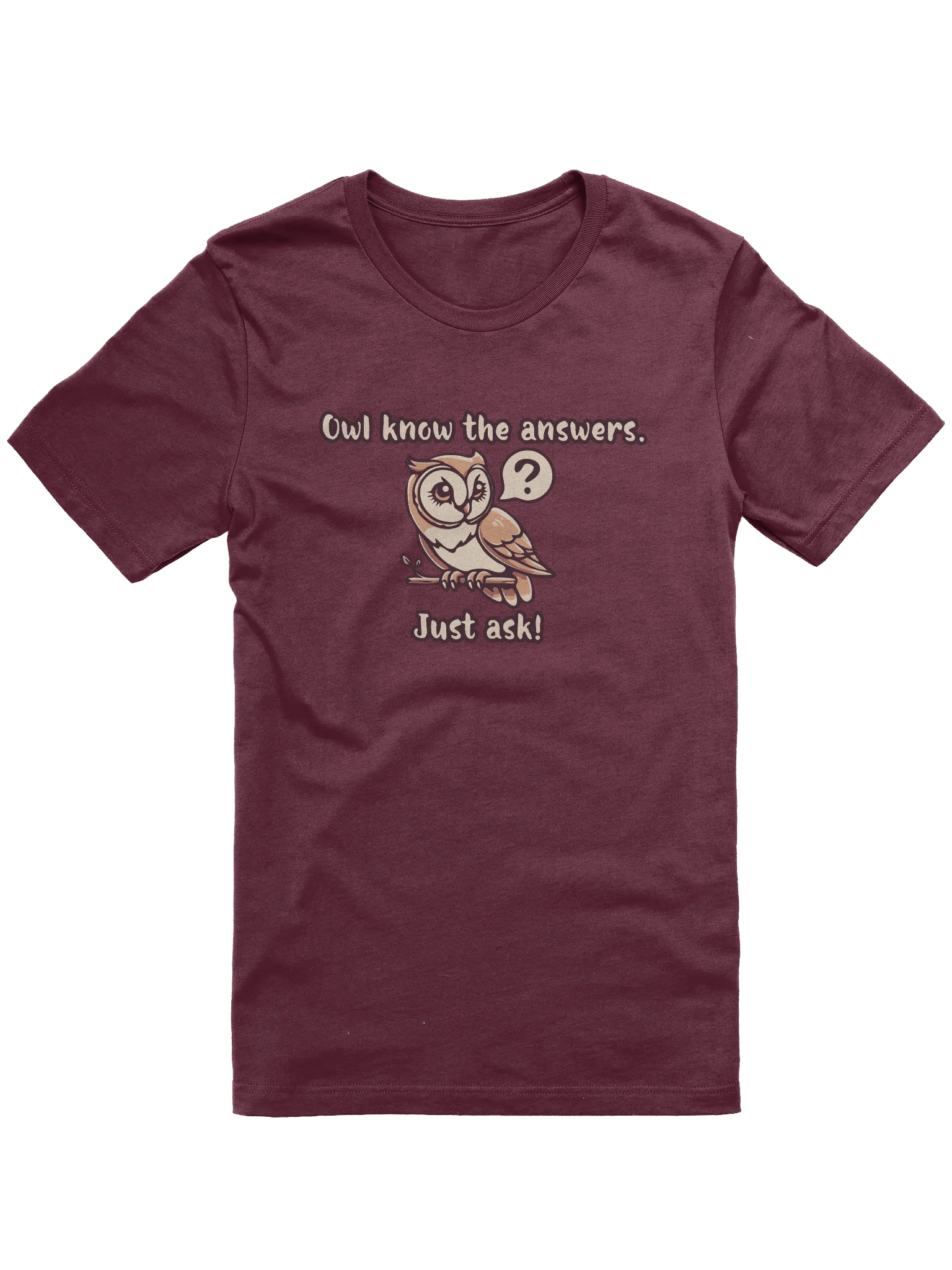 Show off your love for wisdom and wit with our charming “Owl Know the Answers” tee! Featuring an adorable owl perched on a branch, this shirt combines playful humor with a friendly invitation to ask questions. Perfect for nature lovers and those who appreciate a good pun, it’s a great conversation starter for any occasion. Wear it proudly and let everyone know you’ve got the answers—just ask!